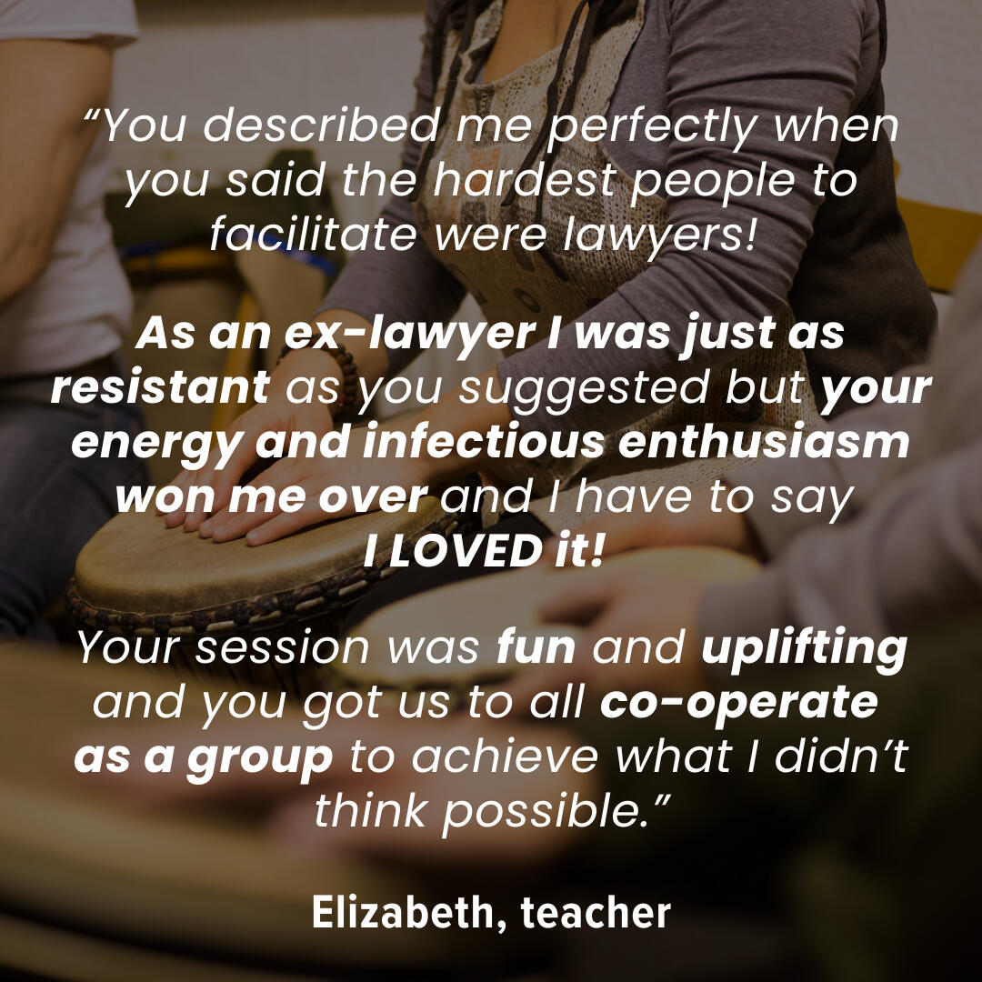 "The Rhythmworx team provided a sensational start to our client’s leadership program by engaging everyone in the group to come out of their comfort zone and make music together as a team.I will definitely engage them again to bring energy and connection to our programs.“